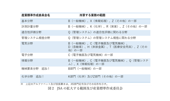 JSAでは、さらなるJIS案作成の迅速化に貢献するために、段階的に認定の範囲を拡大することを計画しており、このたび経済産業大臣の認定を受け、新たに2分野約600規格(機械要素、化学分野)を対象範囲といたしました(図2)。これによって、JIS全体の2割以上をカバーする約2,200件のJIS案作成が可能となりました。