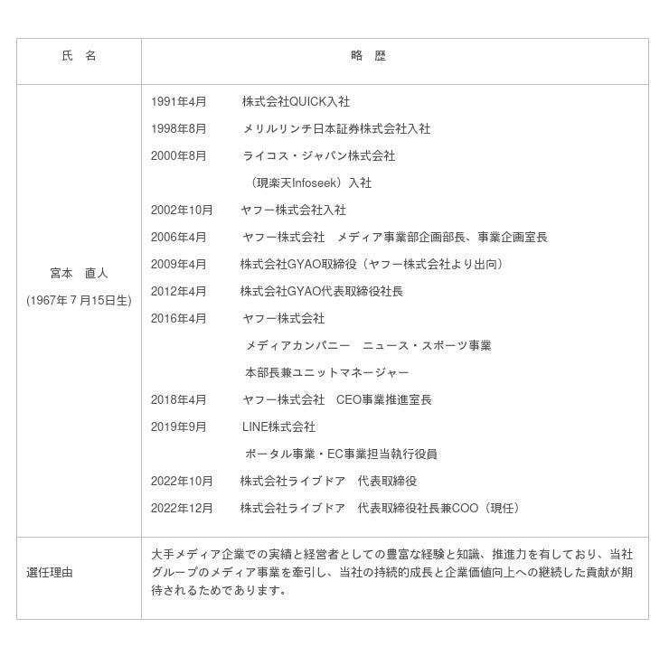 ※ 宮本直人は、100%子会社である株式会社ライブドアの代表取締役社長 兼 COO兼任であります。