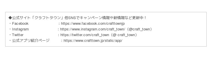 事業内容 : 手芸用品・ソーイング用品・編み物用毛糸・衣料品・服飾品、その他生活関連雑貨などの店頭販売・通信販売。店舗は手芸用品・クラフト専門店「クラフトハートトーカイ」「クラフトパーク」「クラフトワールド」「クラフトループ」を路面店チェーン展開及びショッピングセンター等商業施設への出店。さらに、キャラクター手芸店「キャランキャラン」、生活雑貨専門店「サントレーム」なども展開しています。公式オンラインショップ「クラフトハートトーカイドットコム」(https://ec.crafttown.jp/)では、豊富で様々な手芸用品通信販売でお求めいただけます。さらに、生活雑貨のセレクトショップ「サントレーム」を楽天市場に出店しています。