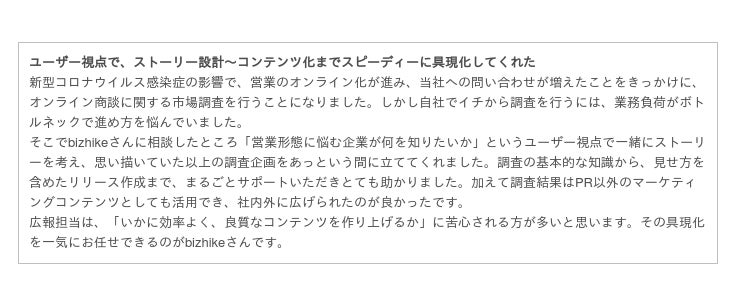 bizhikeは事業企画を中心としたサービスを約50社の法人に提供しています。その中でも「調査型(サーベイ)PR」は、自社サービスの認知・信頼獲得に広くつなげることができるという側面から、多くのご支援を重ねてきました。
