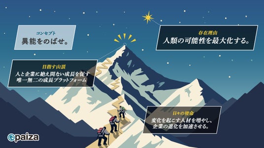 また、paizaメンバーならびにpaizaに関わってくださる全ての関係者の方と共通認識をもつためにミッション・ビジョン・バリューという呼称ではなく、具体的にイメージしやすい「存在理由」「目指す山頂」「日々の使命」という呼称を採用しています。