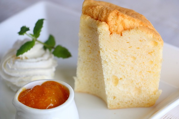 ゆり庵のシフォンケーキは、こんにゃくの膨張性・保水性を活かして、ベーキングパウダー使っていない、他にはないシフォンケーキやで。また、オイルは健康の事を考えて、グレープシードオイルを使用してるねん。こんにゃくを混ぜ込む事で、当社比で30%のカロリーオフに成功してはる。添加物や保存料を使用してない安全・安心のシフォンケーキやで。