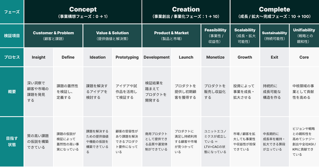 株式会社Relicでは新規事業開発を「3つのフェーズ・7つの検証項目・10のプロセス」に体系化し整理しております。