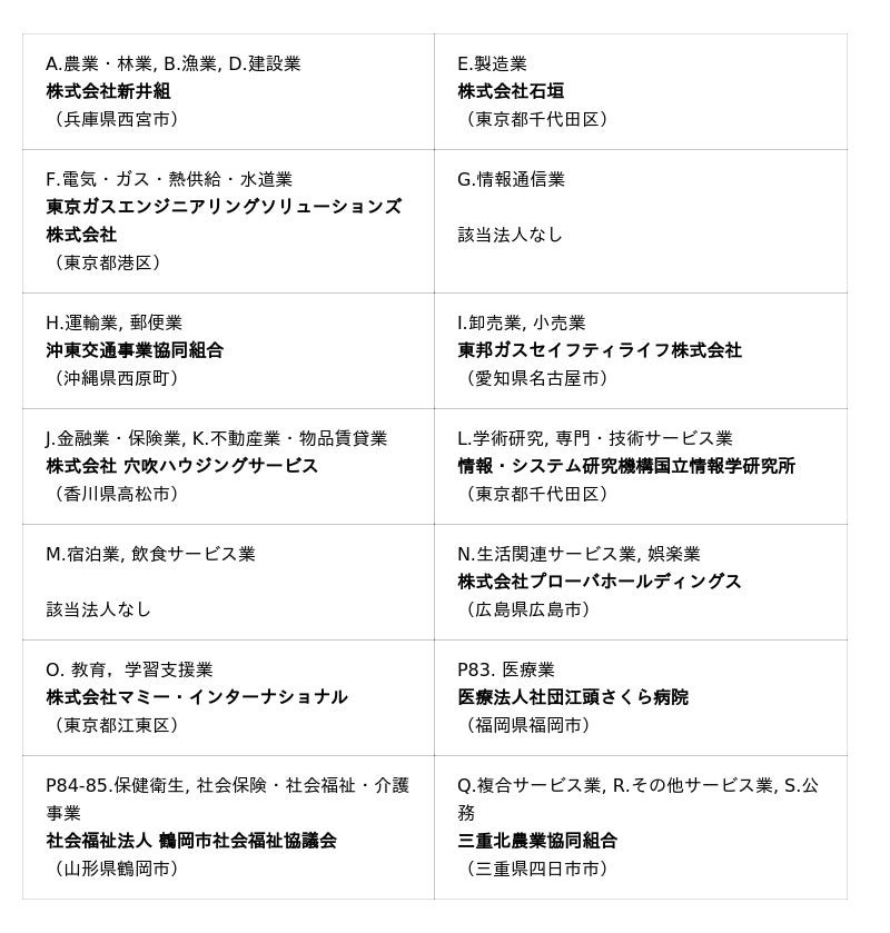 「ストレスチェック業界平均値レポート」の14業界区分(「T.分類不能の産業」を除く)別に、大企業部門(従業員300人以上)・一般企業部門(従業員300人未満)に分け、業界区分ごとに2社・最大で28社を部門別「ストレスチェック大賞」選考のノミネート法人として弊社で選出。各業界・部門によって、上位法人の「総合健康リスク」値や「高ストレス者割合」「回収率(受検率)」の値が思わしくない場合、あるいは受賞辞退が出た場合は「該当法人なし」としています。