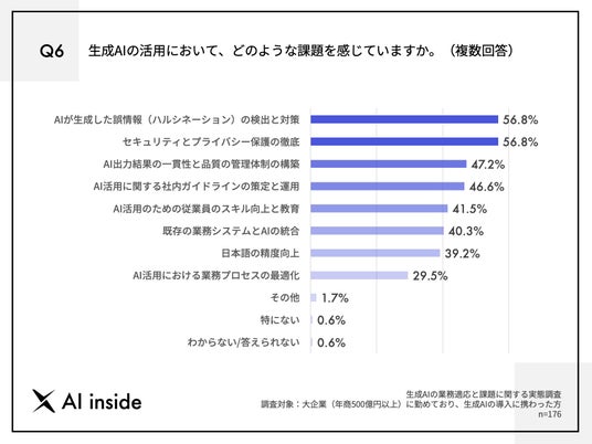 Q1で「全社的に本格活用中」「一部の部門で活用中」「試験的に活用中(PoC実施中含む)」と回答した方に、「Q6.生成AIの活用において、どのような課題を感じていますか。(複数回答)」(n=176)と質問したところ、「AIが生成した誤情報(ハルシネーション)の検出と対策」が56.8%、「セキュリティとプライバシー保護の徹底」が56.8%、「AI出力結果の一貫性と品質の管理体制の構築」が47.2%という回答となりました。