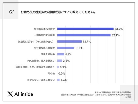 AIプラットフォームを提供するAI inside 株式会社(代表取締役社長CEO:渡久地 択、本社:東京都渋谷区、以下「AI inside」)は、年商500億円以上の大企業に勤めており、業務における生成AIの導入に携わった方218名を対象に、生成AIの業務適応と課題に関する実態調査を実施しました。