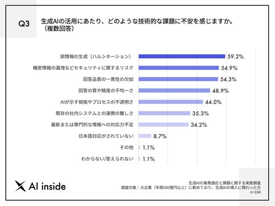 Q2で「非常に感じている」「やや感じている」と回答した方に、「Q3.生成AIの活用にあたり、どのような技術的な課題に不安を感じますか。(複数回答)」(n=184)と質問したところ、「誤情報の生成(ハルシネーション)」が59.2%、「機密情報の漏洩などセキュリティに関するリスク」が54.9%、「回答品質の一貫性の欠如」が54.3%という回答となりました。