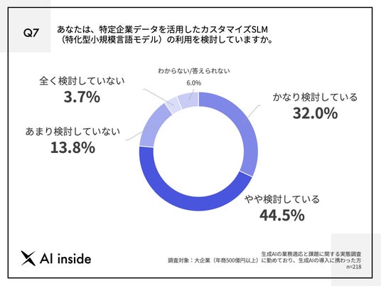 「Q7.あなたは、特定企業データを活用したカスタマイズSLM(特化型小規模言語モデル)の利用を検討していますか。」(n=218)と質問したところ、「かなり検討している」が32.0%、「やや検討している」が44.5%という回答となりました。