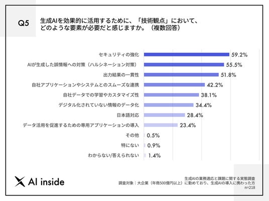 - 効果的な生成AI活用のために求められる要素、第1位「セキュリティの強化」(59.2%)、第2位「ハルシネーション対策」(55.5%)