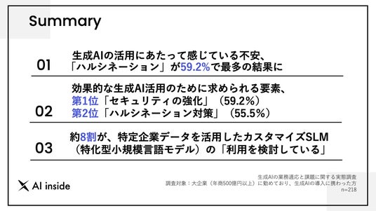 今回の調査では、生成AIの業務適用に関する技術的課題や、不安が明らかになりました。特に「ハルシネーション」や情報漏洩などの「セキュリティリスク」が活用障壁として大きく、実用化に向けた対策が求められています。