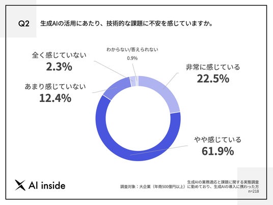 「Q2.生成AIの活用にあたり、技術的な課題に不安を感じていますか。」(n=218)と質問したところ、「非常に感じている」が22.5%、「やや感じている」が61.9%という回答となりました。