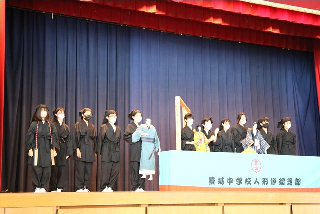 豊城中学校の人形浄瑠璃部は、校区内の豊橋市飽海町で江戸時代の慶長の頃から始まり400年の歴史があるとされる、豊橋市の指定無形民俗文化財「飽海人形浄瑠璃(あくみにんぎょうじょうるり)」を保存・継承する活動を行っており、これまで15年に渡り活動してきました。さまざまなイベントや文化祭で演目を披露しており、地元の吉田文楽保存会が講師を務めています。1体の人形を3人で操り、太夫(語り手)と三味線が紡ぐストーリーに合わせて、物語が展開します。