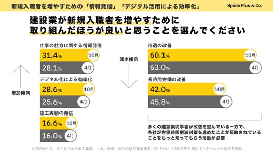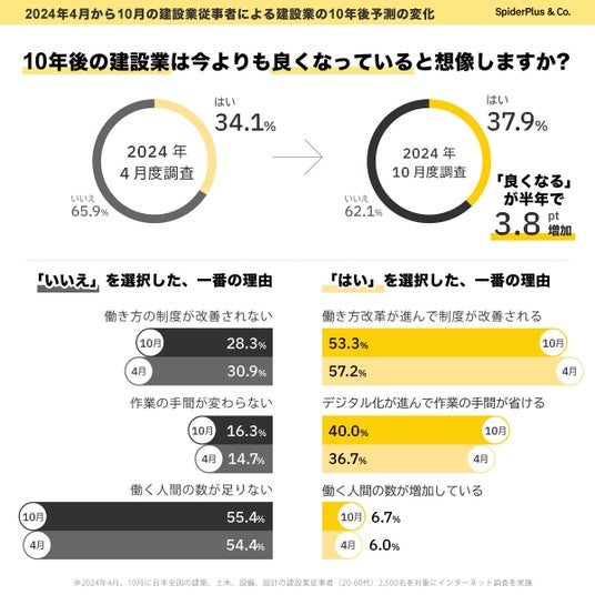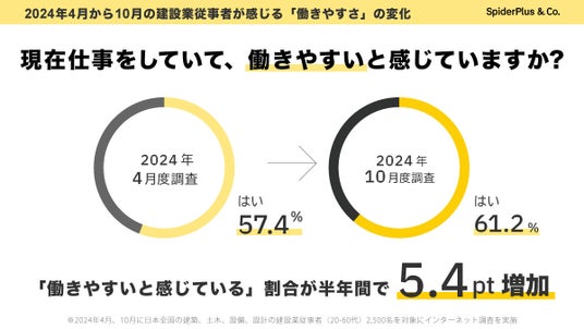 建設DXサービス「SPIDERPLUS」を提供するスパイダープラス株式会社(以下「当社」)は、2024年の4月と10月の2度にわたり、建設業従事者を対象にしたアンケート調査を行い、働きやすさや働きがいの実感について分析いたしました。