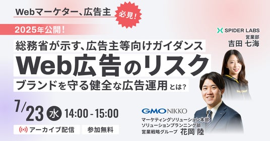 株式会社Spider Labs(本社:東京都港区、代表取締役:大月 聡子)は、2025年6月26日にGMO NIKKO株式会社と共催した無料ウェビナー「広告主等向けガイダンスを読み解く ~デジタル広告の健全な運用に向けて~」について、好評を受けて2025年7月23日(火)にアーカイブ配信を実施いたします。