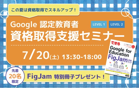 セミナーの受講をお申し込みいただいた方の中から先着20名様へ『できる Google for Education FigJam 実践ガイド(特別版)』をプレゼントする企画が、大好評につき延長決定! Google Jamboard(TM) の後継デジタルホワイトボードである FigJam の基本操作から授業実践のアイデアまで分かりやすく解説した本冊子は、書店で販売されていない非売品です。冊数に限りがあるので、この機会をお見逃しなく!資格とともに、今話題の FigJam についての特別な冊子も手に入れて、ICT活用の幅を広げましょう!