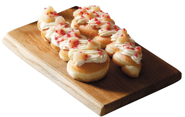 お店で泡立てたホイップクリームにチーズクリームを混ぜた特製のクリームをドーナツにたっぷり絞り、桃のソースと桃のダイスをふんだんにのせ、乾燥ラズベリーを飾りました。