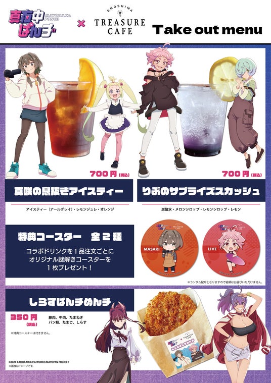 ENOSHIMA TREASURE CAFEでは従来のメニューにプラスして、『真夜中ぱんチ』オリジナルコラボドリンクとテイクアウト商品の提供を実施いたします。