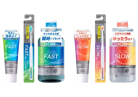 左から、OCH-TUNEハミガキ FAST ブルーリフレッシュミント(※3*1)130g、OCH-TUNEハブラシ FAST コンパクト ミディアム、OCH-TUNEマウスウォッシュ FAST クールドライミント(※4*2) 600ml、OCH-TUNEハミガキ SLOW ハーバルリラックスミント(※5*1)130g、OCH-TUNEハブラシ SLOW コンパクト ミディアム、OCH-TUNEマウスウォッシュ SLOW シルキーマイルドミント(※6*2)600ml