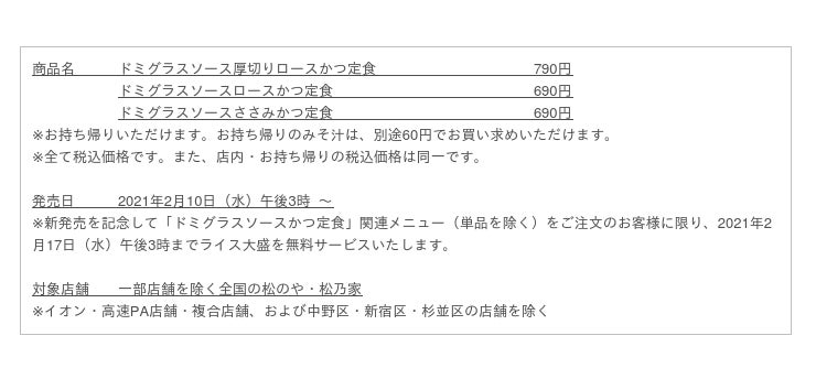 株式会社松屋フーズ(本社:東京都武蔵野市、代表取締役社長:瓦葺 一利)では、とんかつ専門店の「松のや・松乃家」におきまして、2021月2月10日(水)午後3時より「ドミグラスソースかつ」を発売いたします。