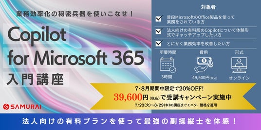 プログラミングスクール「SAMURAI ENGINEER(侍エンジニア)」を運営する株式会社SAMURAIは、Microsoft製品の生産性を最大化する活用術を習得し、圧倒的な業務効率化を目指す実践型研修『Copilot for Microsoft 365 入門講座』を、2024年7月23日 (火) より新規開講いたします。