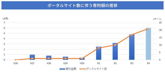 掲載ポータルサイトの増加に連動して寄附額が増加。自動連携だから増やすのも簡単