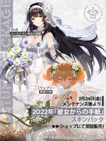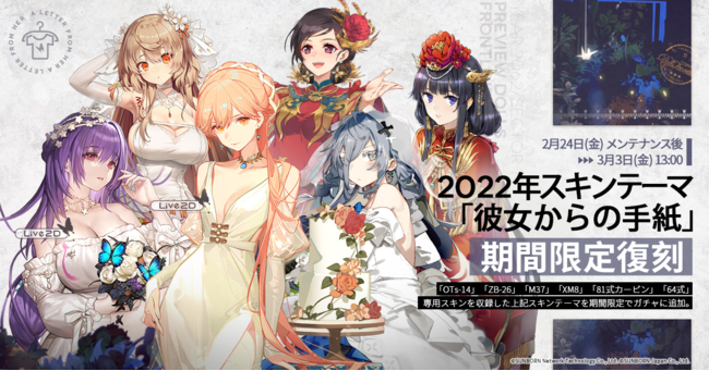 Live2D機能が付いたスキンが複数入っている2022年のスキンテーマ『彼女からの手紙』が「2月24日(金)メンテナンス後」から1週間の期間限定で復刻します。