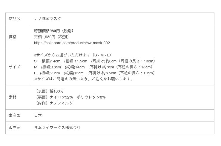 サムライワークス株式会社(代表取締役社長:新島 実 本社所在地:東京都渋谷区)は、感染防止と経済の両立に向け、フィルターには医療用レベルで飛沫防止ができる『ナノ抗菌マスク』を完売につき、本日より数量限定で特別価格の1枚980円(税別)で追加販売を開始します。