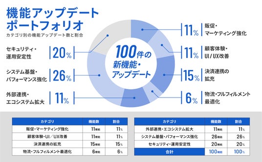 年間100機能のアップデートの内訳は、販促・マーケティング強化11%、顧客体験・UI/UX改善11%、決済連携の拡充15%、物流・フルフィルメント最適化6%、外部連携・エコシステム拡大11%に加え、システム基盤・パフォーマンス強化26%、セキュリティ・運用安定20%で構成されています。