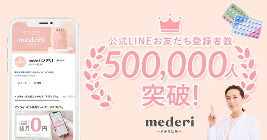 オンラインピル診療サービス「mederi Pill(メデリピル)」、企業向け健康支援・福利厚生サービス「mederi for biz(メデリフォービズ)」を提供するmederi株式会社(本社:東京都渋谷区、代表取締役 坂梨 亜里咲 以下、mederi)は、2026年2月、LINE公式アカウントの友だち登録者数が50万人(2026年2月10日時点:500,504人)を突破いたしました。