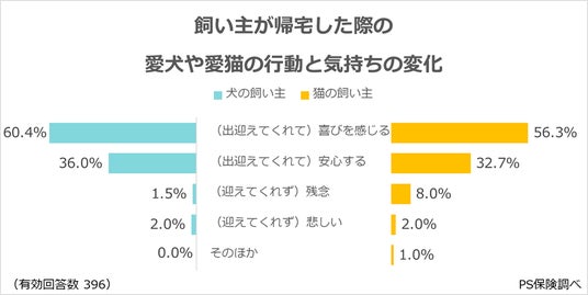 ・「(出迎えてくれて)喜びを感じる」が最多(犬の飼い主:60.4%、猫の飼い主:56.3%)。