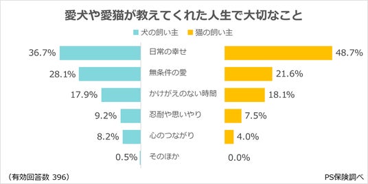 ・「日常の幸せ」(犬:36.7%、猫:48.7%)が最多。