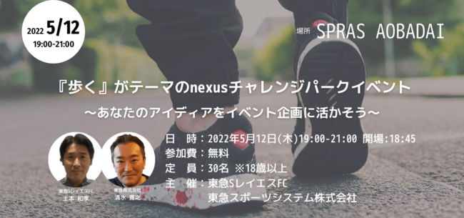 東急SレイエスFCがnexusチャレンジパークで開催するイベントを一緒に考えるためのワークショップです。「歩く」をキーワードに多世代交流や地域との繋がりをイベントの魅力としてどのように展開させるか、参加される皆様で様々なアイディアを出し合い、イベントに活かす企画をアウトプットします。