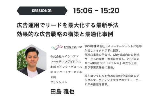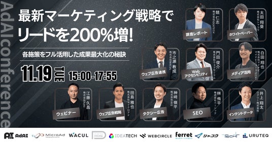 株式会社マイクロアド(本社:東京都渋谷区、代表取締役 社長執行役員:渡辺健太郎)は、11月19日(木)に株式会社AdAI(本社:東京都渋谷区、代表取締役 江藤久昌)が主催する、BtoBマーケティング担当者に向けのカンファレンス「最新マーケティング戦略でリードを200%増! 各施策をフル活用した成果最大化の秘訣」へ登壇いたします。