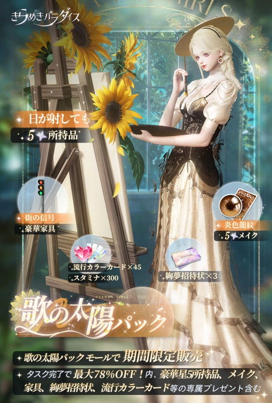 パックには、星5所持品『日が射しても』、星5メイク『炎色龍紋』、豪華家具『街の信号』、絢夢招待状×3、スタミナ×300、流行カラーカード×45など、豪華報酬が盛りだくさん。特に星5所持品は専用の動作ポーズを楽しむことができますので、ぜひゲーム内でチェックしてくださいね。