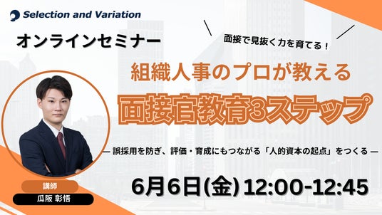 組織・人事コンサルティングファームであるセレクションアンドバリエーション株式会社(以下、当社、東京都千代田区丸の内、大阪市西区、名古屋市西区 / 代表取締役社長:平康慶浩/ URL:https://sele-vari.co.jp/ )は『面接で見抜く力を育てる!組織人事のプロが教える面接官教育3ステップ ― 誤採用を防ぎ、評価・育成にもつながる「人的資本の起点」をつくる ―』セミナーを2025年6月6日(金)12:00~12:45に開催することをお知らせいたします。