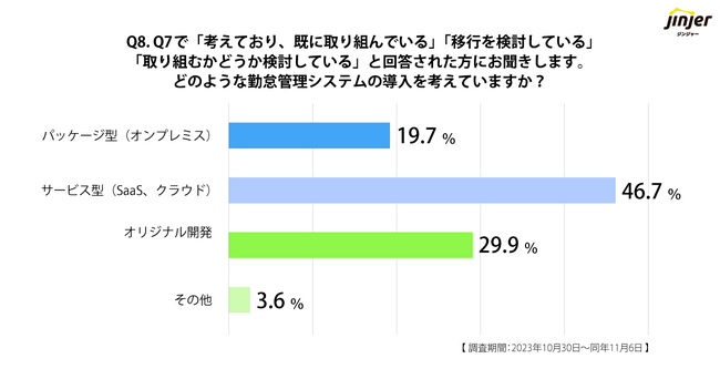 また、Q7で「考えており、既に取り組んでいる」「移行を検討している」「取り組むかどうか検討している」と回答した企業を対象に、「どのような勤怠管理システムの導入を考えていますか?」という質問をしました。その結果「サービス型(SaaS、クラウド)」が46.7%と最も多く、次いで「オリジナル開発(29.9%)」、「パッケージ型(オンプレミス)(19.7%)」という回答が得られました。