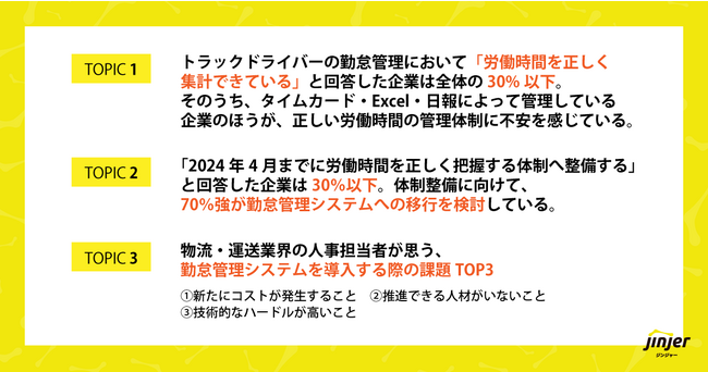クラウド型人事労務システム「ジンジャー」を提供しているjinjer株式会社(本社:東京都新宿区 代表取締役社長:桑内 孝志 以下、jinjer)は、物流・運送業界に携わる企業の人事担当者445名を対象に「物流・運送業界における勤怠管理」に関する実態調査を実施しました。