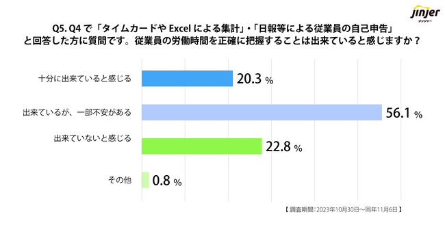 また、Q4の質問で「タイムカードやExcelによる集計」「日報等による従業員の自己申告」と答えた企業を対象に、「従業員の労働時間を正確に把握することが出来ていると感じますか?」と質問したところ、「出来ているが、一部不安がある(56.1%)」「出来ていないと感じる(22.8%)」と、合わせて80%弱が正確な勤怠管理に「不安を感じている」という回答が得られました。
