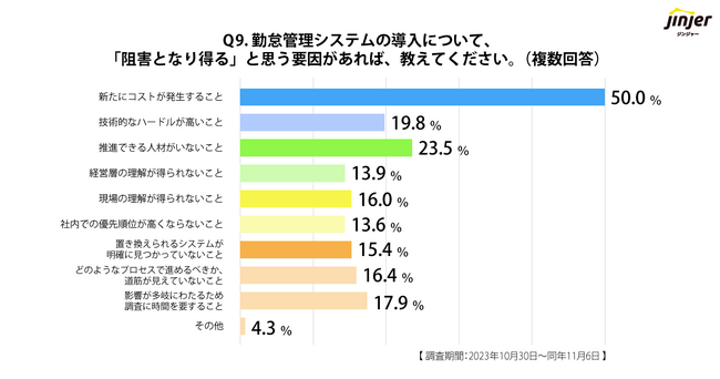 Q7で「考えており、既に取り組んでいる」「移行を検討している」「取り組むかどうか検討している」いずれかを選択した企業と、Q8で「勤怠管理システム(オンプレミス)」「勤怠管理システム(SaaS・クラウド)」と回答した企業を対象に、「建設業界における勤怠管理システムの導入について”阻害となり得る”と思う要因があれば、教えてください」という質問をしました。