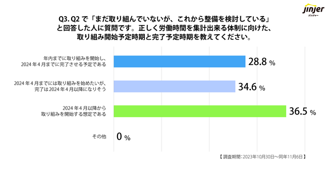 Q2の質問で「まだ取り組んでいないが、これから整備を検討している」と回答した企業を対象に、正しく労働時間を集計出来る体制に向けた、取り組み開始予定時期と完了予定時期を聞いたところ、「2024年4月までには取り組みを始めたいが、完了は2024年4月以降になりそう(34.6%)」「2024年4月以降から取り組みを開始する想定である(36.5%)」と、70%以上の企業が上限規制適用後に労働時間を正しく把握する体制を整備しようとしていることがわかりました。