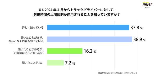 2024年4月から施行される物流・運送業界(トラックドライバー)の労働時間規制に関して「70%強」が内容を詳しく把握できていることから、「上限規制」に関する「認知度は高い傾向」にあり。