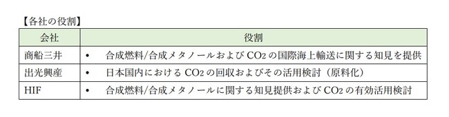 株式会社商船三井(代表取締役社長:橋本 剛、本社:東京都港区、以下「当社」)は、出光興産株式会社(以下「出光興産」)、合成燃料/合成メタノールを製造するグローバル企業の HIF Globalの子会社である HIF USA LLC および HIF Asia Pacific Pty Limited(以下「HIF」)と、CO2 の海上輸送を含む合成燃料(e-fuel)/合成メタノール(e-ethanol)のサプライチェーンを共同開発することで合意し MOU を締結しました。