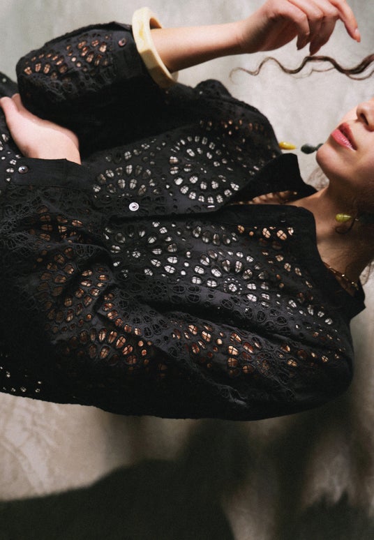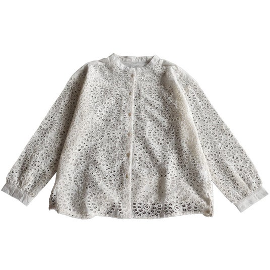 光も味方にするオトナの余裕を演出。インド綿特有のエアリーな風合いが魅力のブラウス。程よい透け感で、さりげなく肌を見せることができます。花のような刺繍柄の愛らしさで、大人の余裕と上品さをプラスしました。