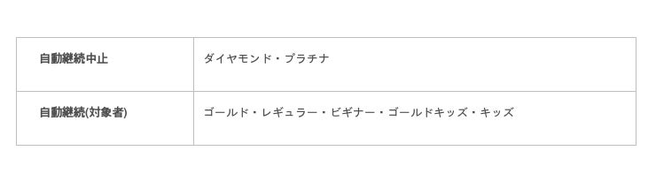 「ダイヤモンド」、「プラチナ」につきましては、自動継続を中止とさせていただきます。継続をご希望の会員さまは下記を参照のうえ、継続のお手続きをお願いいたします。