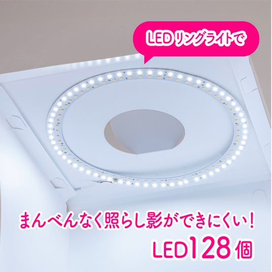 「LEDリングライト付き撮影BOX」は、手軽に小物をきれいに撮影することができる組み立て式の撮影BOXです。上部に設置されているUSB給電式LEDリングライトはLEDを128灯搭載しており、撮影対象をまんべんなく照らすことができるので影ができにくくなります。