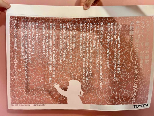 広告内には二次元コードを掲載。読み取ると、動画「玄関あけたらラブストーリー」を視聴することができます。通勤や通学、旅の途中でふと目に留まる“静”の切り絵から、家族のもとへ帰る歓喜を描いた“動”の映像へ。広告を見る体験そのものが、安全運転を自分ごととして考えるきっかけになることを願っています。