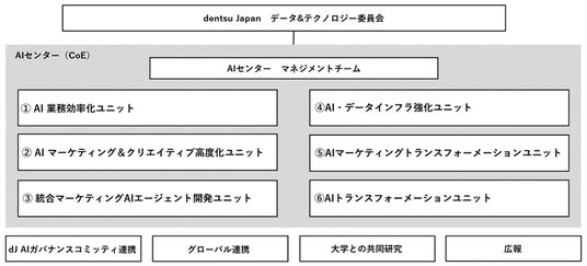 当センターは、AIに関する技術・データ・人財・知見を横断的に結集し、国内電通グループ全体のAIネイティブ化をけん引する役割を担います。また、当社内でのAI開発・導入・活用にとどまらず、顧客のAI開発・導入・活用の支援も重要なミッションとして位置づけています。業務効率化やマーケティングの高度化だけでなく、AIエージェントの開発、AIデータインフラの強化、顧客のバリューチェーン全領域でのAI変革までを視野に入れた包括的な戦略を推進するため、次の6つの専門ユニットを編成して、横断的かつ実践的な活動を展開していきます。