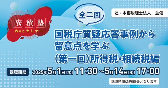 辻・本郷 税理士法人(本社:東京都新宿区、理事長:桑木小恵子)は、2025年5月1日(木)よりWebセミナー「【安積塾】全二回 国税庁質疑応答事例から留意点を学ぶ(第一回)所得税・相続税編」を開催いたします。第一回となる本セミナーでは、令和6年11月に更新された国税庁質疑応答事例の内容のうち、所得税及び相続税を中心に解説します。※本セミナーは全二回を予定しており、第二回は法人税・消費税編を予定しています。