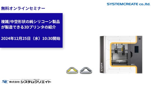 株式会社システムクリエイト(本社:大阪府東大阪市荒本新町、代表:川上正義)は、2024年12月25日(水)10:30に、無料オンラインセミナー「複雑/中空形状の純シリコーン製品が製造できる3Dプリンタの紹介」を開催いたします。
