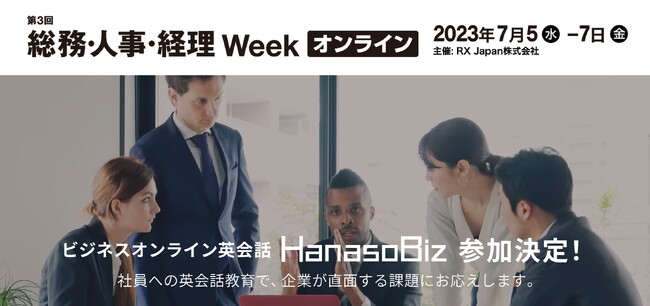 株式会社アンフープ(所在地:静岡県富士市、代表取締役社長:重森 渉)がサイト運営する、ビジネスオンライン英会話HanasoBizは、2023年7月5日(水)から7日(金)までオンラインで開催される第3回総務・人事・経理Week[オンライン]に出展いたします。